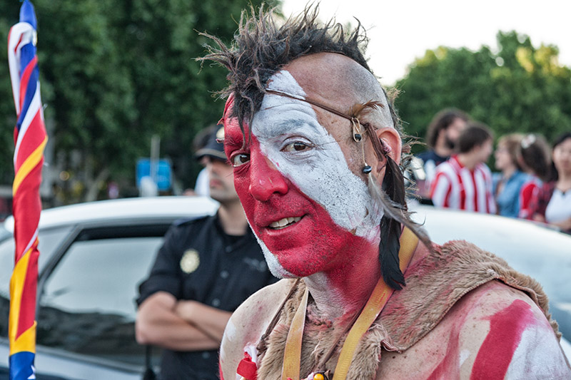 | Un indiano urbano e il mohawk é pure posticcio ... rigurgiti tribali di una cultura non sua, con il poliziotto (?) dietro che vigila. Un'immagine davvero singolare. |