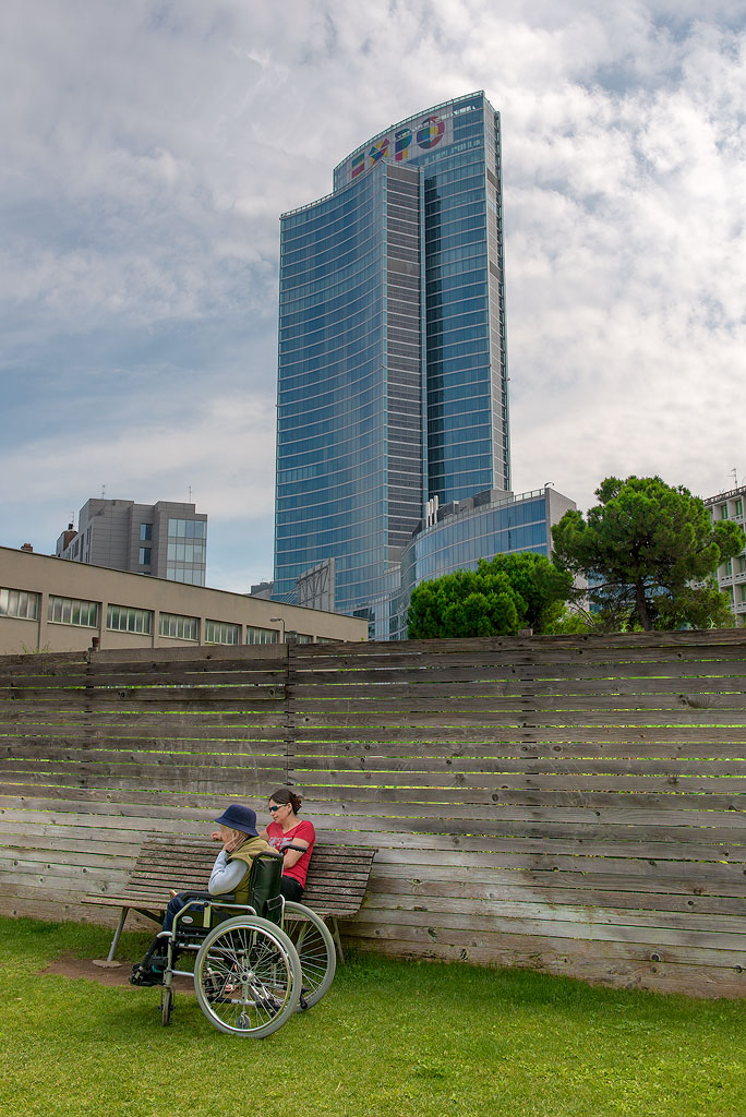 Il dualismo sembra dominare questo bello e sensibile scatto:verde,legno,calore(umano e cromatico) da un lato ed oltre il divisorio vetro,cemento,freddo.Anche i due soggetti tanto diversi come età e condizione.Ottima composizione e grande nitidezza.Complimenti! Smile