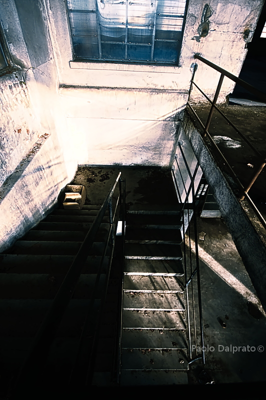 @Gennaro, provo a raccontare la mia intenzione: fabbrica abbandonata (in realtà quasi, insomma non è abbandonata ma questa è una parte in disuso, solo che qui non si capisce ovviamente), luce che entra dai finestroni e illumina a chiazze le pareti alternandosi con ampie zone d'ombra. Silenzio rotto solo dai rumori della ferrovia che passa proprio dietro e dalle gocce d'acqua che cadono nelle pozzanghere che si trovano anche dentro. Questa scala, mi sono avvicinato alla balaustra puntando verso il basso, cercando di non prendere la balaustra ed il pianerottolo per dare la sensazione del vuoto sotto, per provare a descrivere una situazione di pericolo. E nelle situazioni di pericolo non c'è il rigore della composizione, anzi. Sono conscio che avere una certa intenzione e riuscirci sono due cose ben diverse e non basta che io dica "era così che la volevo", per questo mi piacerebbe sapere se qualcosa è passato o il tutto rimane sotto la voce "seghe mentali" Wink