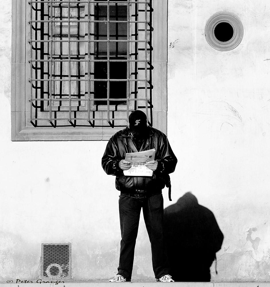 L'ombra è interessante ed attraente poichè trasfigura la posizione ed il normale gesto di leggere per strada dell'uomo. E' prostrata rispetto al suo "padre reale".