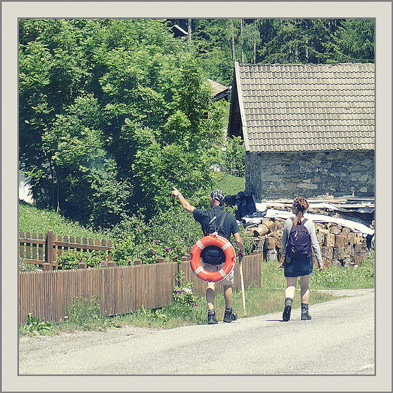 Bella la contrapposizione fra il loro vestito appunto, la casetta con un architettura tipica delle abitazioni di montagna ed il salvagente che in tutto ciò, entra come "i cavoli a merenda"