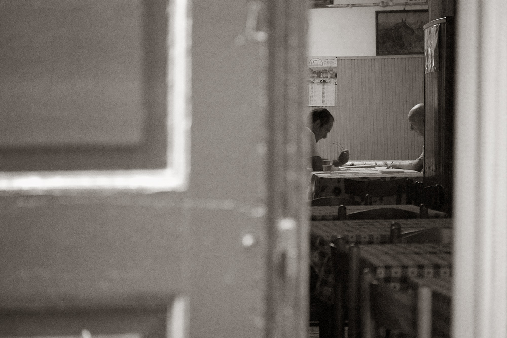 Bello questo sbirciare tra le ante della porta alla scoperta di questi due uomini intenti a leggere o a far di conto con l'ultimo bicchiere della giornata.Complimenti!  |