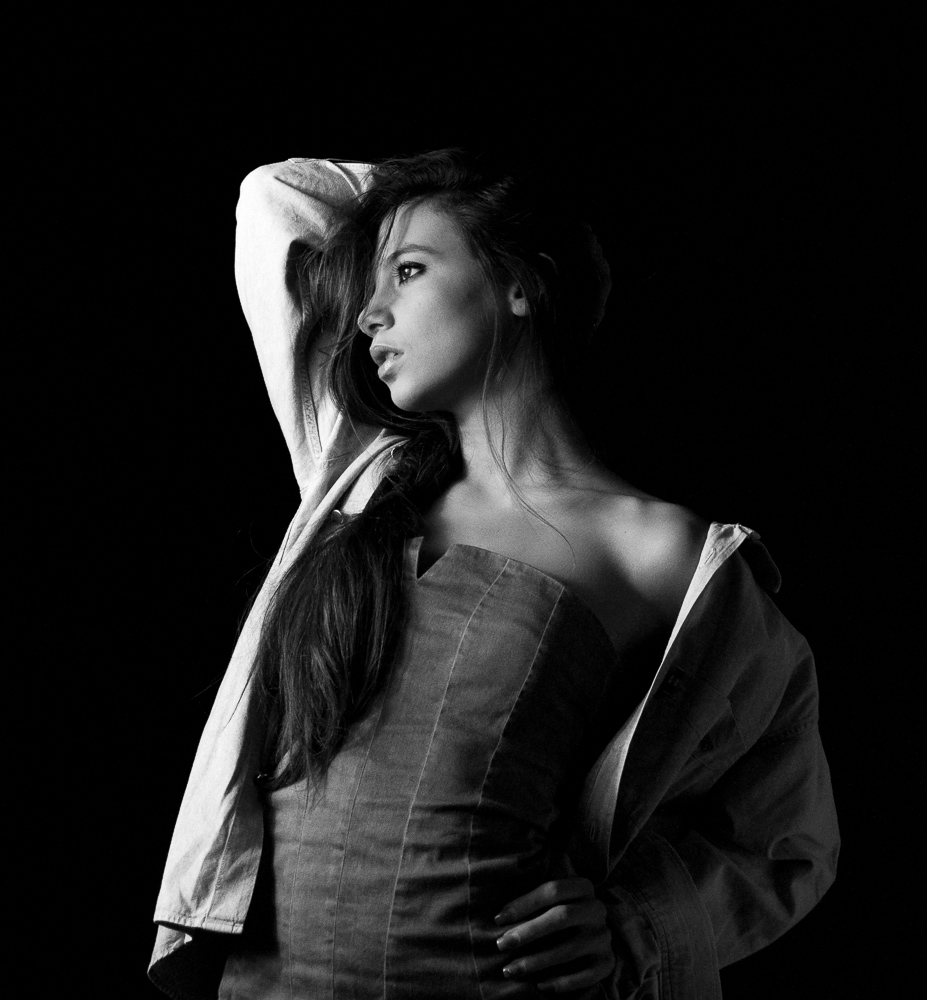 Lei è molto bella. La luce è molto bella. Parti bene quindi. Io avrei però aggiunto anche una luce sullo sfondo, in modo da evitare il nero così piatto. Avrei anche allargato leggermente l'inquadratura in modo da non avere la mano sx che tocca il bordo del fotogramma. Infine sono da tenere sotto controllo i bianchi della camicia.  _________________ Gianluca - www.gianlucabocci.it