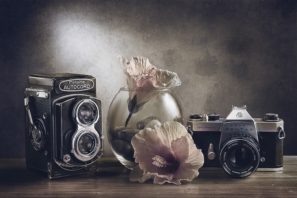 | Decisamente una bella compagnia, la minolta, mitica e sempre troppo sottovalutata, e la grande spotmatic con su il 55 1,8 Takumar (piccola grande ottica) divise da fiori di ibisco. LO sfondo, a mio parere, è un po' troppo presente,lo vedrei o più neutro o più sfocato |