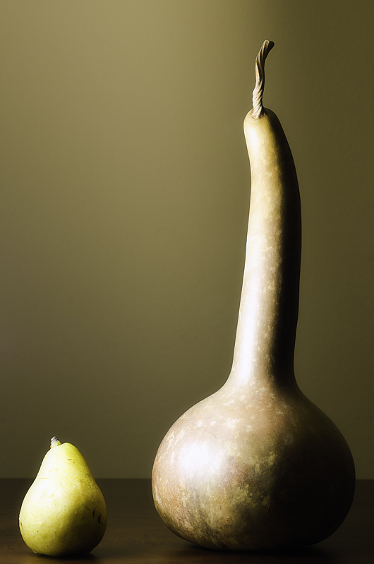 La "pera gigante" contrapposta alla "pera vera" è un soggetto interessante ma lo scatto andrebbe curato meglio a partire dalla luce che è troppo "sparata".