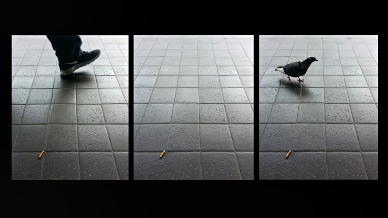 Il pavimento come protagonista e gli elementi casuali, prima il piede poi il nulla ed infine il piccione costruiscono una scena intrigante.
