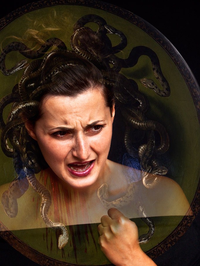 L'idea di sovrapporre il viso a quello di Medusa rende più drammatica la scena... anche se chi è molto arrabbiato ha un diavolo per capello e non un serpente Smile