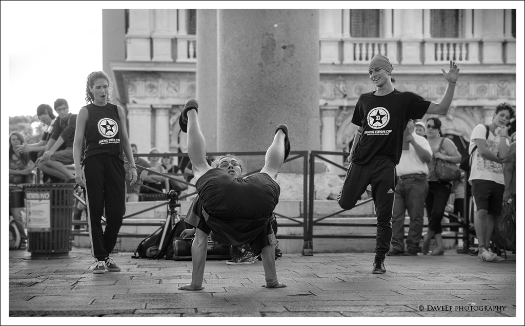 Mi piacciono le foto ad artisti di strada e mi piace farle ma questa purtroppo non mi piace. Non che sia una brutta foto ma non ha nulla di particolare se non documentare un po' di break. Troppo comune. Pur mostrando una posa difficile e due espressioni diverse per me finisce li...