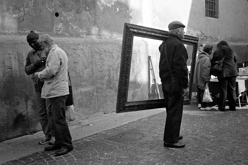 Ciao...mi permetto...a me piace...la cornice trasportata dall'uomo è come un magnete per l'occhio, e l'illusione che sia uno specchio è intrigante...i due uomini che confabulano aggiungono altro mistero allo scatto...l'unica cosa che forse un pò distrae sono le due signore...