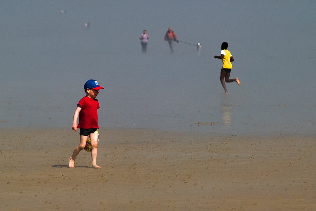 Immagine molto ben bilanciata con l'occhio che salta agevolmente dal bambino in primo piano, a quello nel piano intermedio (tra l'altro di spalle, quasi a suggerire un "successivo" movimento del corpo del primo bambino), alle persone sullo sfondo. Il tutto assieme al degradare dello sfocato, aiutato dalla foschia dettata dalla condizione atmosferica.