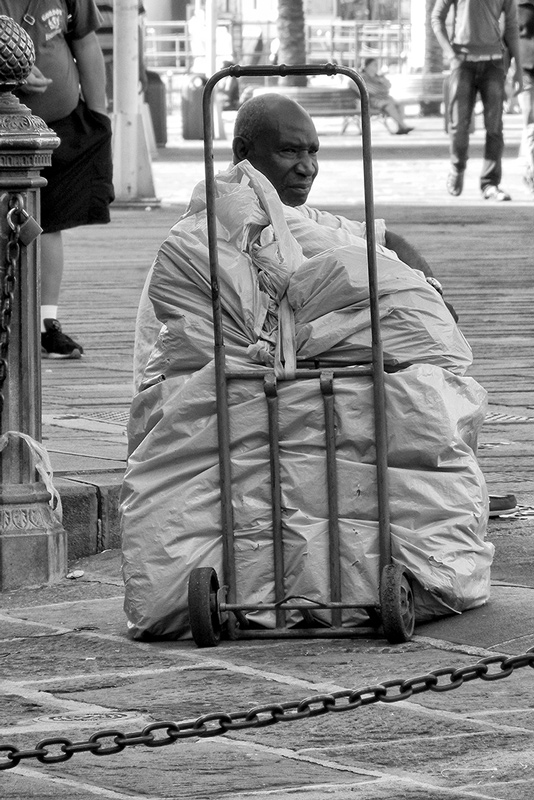 Il sacco forse contenente la mercanzia viene sovrapposto sapientemente al corpo dell'uomo. Street riuscita.
