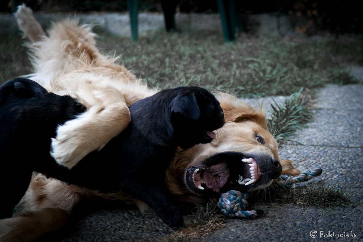 Per fortuna vediamo dalla tua galleria che Zard è bello e buono e che la piccola Janet non corre pericolo. Hai colto il loro gioco in un momento di apparente ferocia... Qui il valore dell'attimo colto, anche se la foto tecnicamente non è molto curata nella compo e poteva essere anche più nitida e pulita.