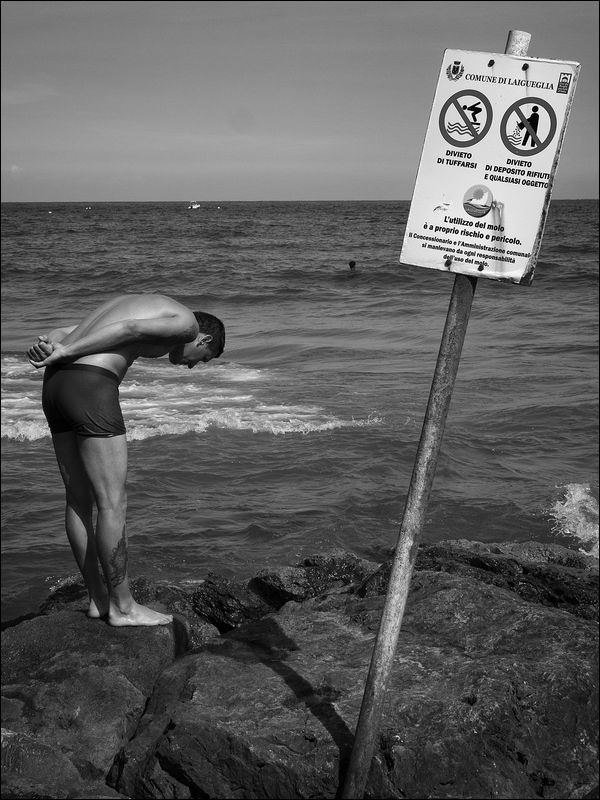 Trovo molto interessante la composizione, con i tre elementi, uomo, cartello, bagnante che formano un triangolo che attribuisce maggiore profondità all'immagine