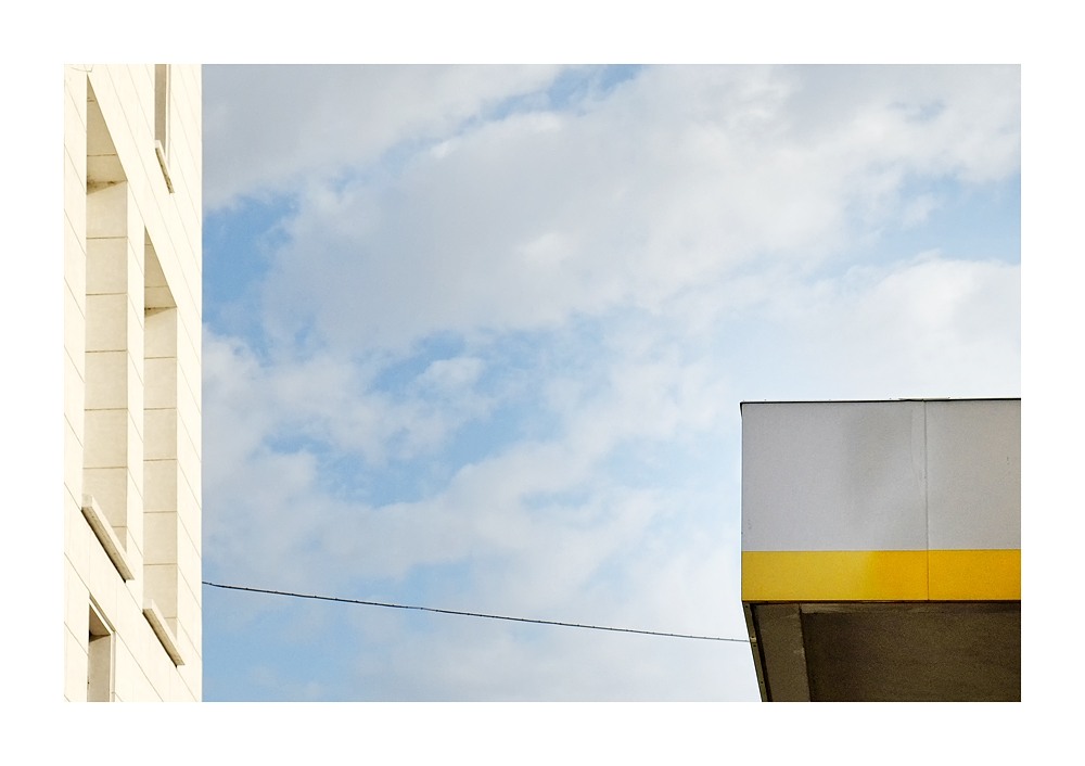 Più che una foto di architettura una foto tra le architetture. Il dialogo tra i due corpi è... legato ad un filo. Il cielo fa delicatamente la sua parte.