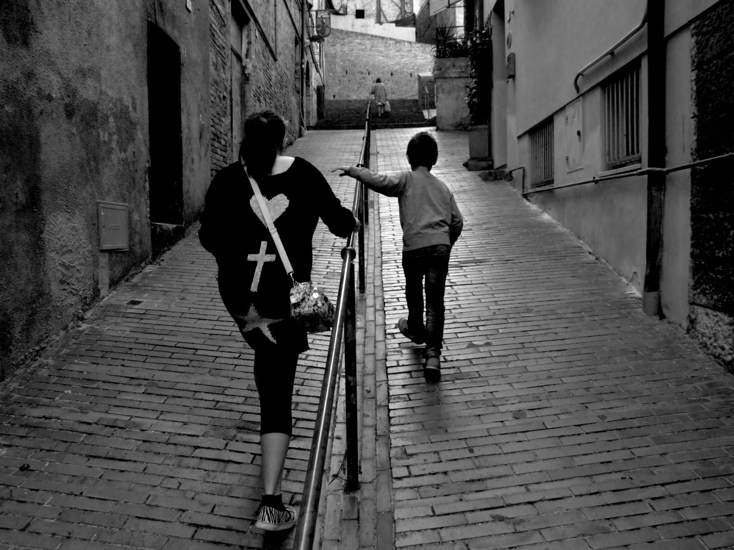 Bello questo avanzare su due binari lungo la salita ed ottimo il punto di ripresa ravvicinato,curiosa la simbologia sulla maglia della signora,buoni il bn e la luce.  |
