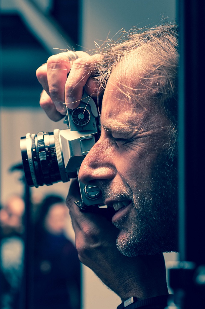 Bella l'espressione del fotografo al momento dello scatto che sintetizza il piacere del fotografare in particolare con la vecchia macchina analogica,mi piace anche il "cross" applicato al colore in tema con il passato.Complimenti! Smile