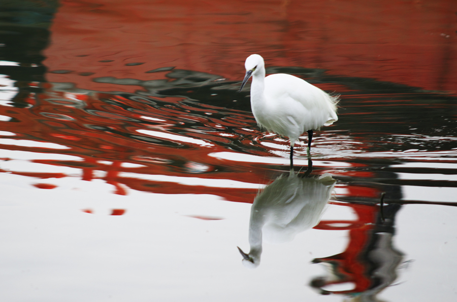 Si, è il riflesso di una barca rimessata sulla riva nei pressi delle saline di Sicciole, in Slovenia. Passavo di li in bici con mio figlio e macchina nello zaino quando ho scorto la garzetta che si avvicendava per la sua cena. Ho anche le foto con il malcapitato granchiolino nel becco.