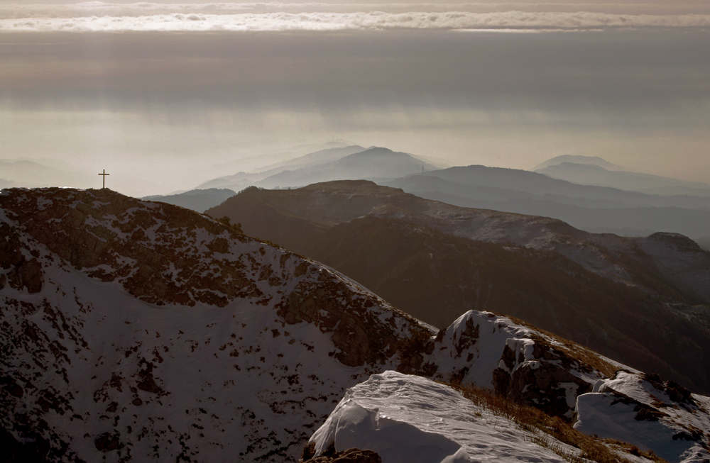 | La trovo sopratutto valida compositivamente: immensa la forza della sottile piccola croce che, a dispetto delle dimensioni relative, domina ai margini la scena con la forza del suo profilo, del suo simbolismo spirituale, nell'ambito di una ripresa naturale in quota. Luce difficile, che ha reso la neve senza bruciature, eppure anche senza vividi brillii di vero bianco. Ma la delicata cascata di luce diffusa dalle nubi spiega ogni cosa.