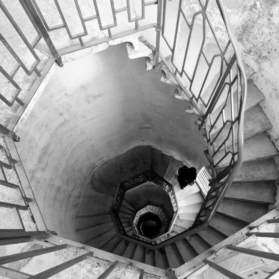 Una spirale che attrae lo sguardo verso il fondo. Avrei provveduto ad abbassare la luminosità dell'area superiore e sinistra e trovo il soggetto umano troppo affogato nel nero e (a causa della postura in cui è stato colto) troppo indistinguibile nella sua silhouette.