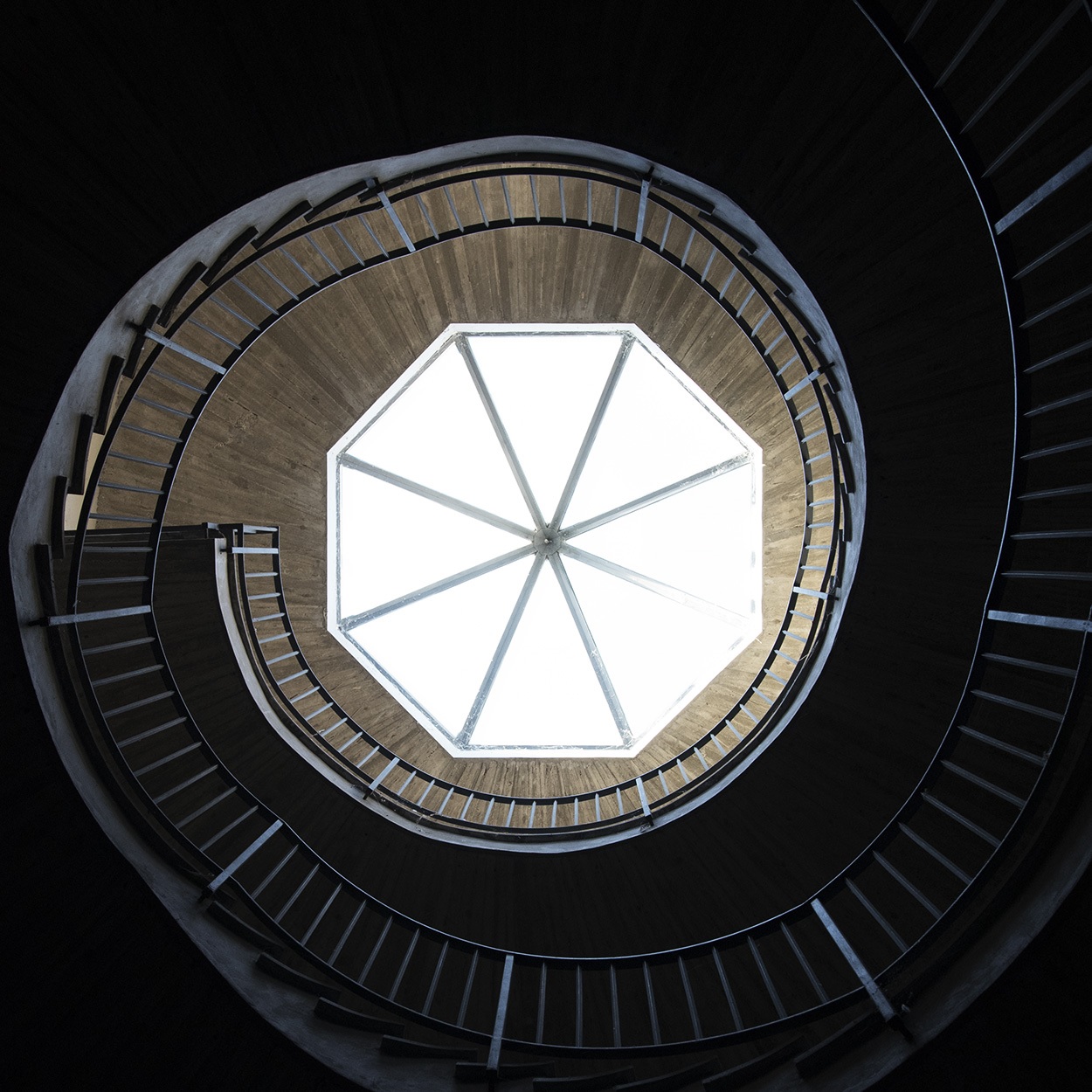 A condizione di essere molto rigorosi nella ripresa. Intanto potresti scegliere un'inquadratura più ampia in modo che la parte inferiore della scala sia interamente compresa all'interno del fotogramma, poi disporti esattamente sulla verticale che parte dal centro del lucernario e infine curare l'esposizione in modo da recuperare qualche dettaglio nella zona delle luci.