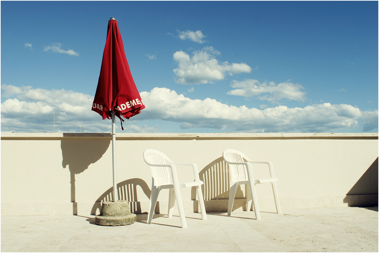 Anche se c'è il sole, le due sedie vuote e l'ombrellone chiuso, fanno pensare ad un'estate ormai finita...bello il taglio, cosi come i cromatismi...per l'ombra a dx, ci devo pensare