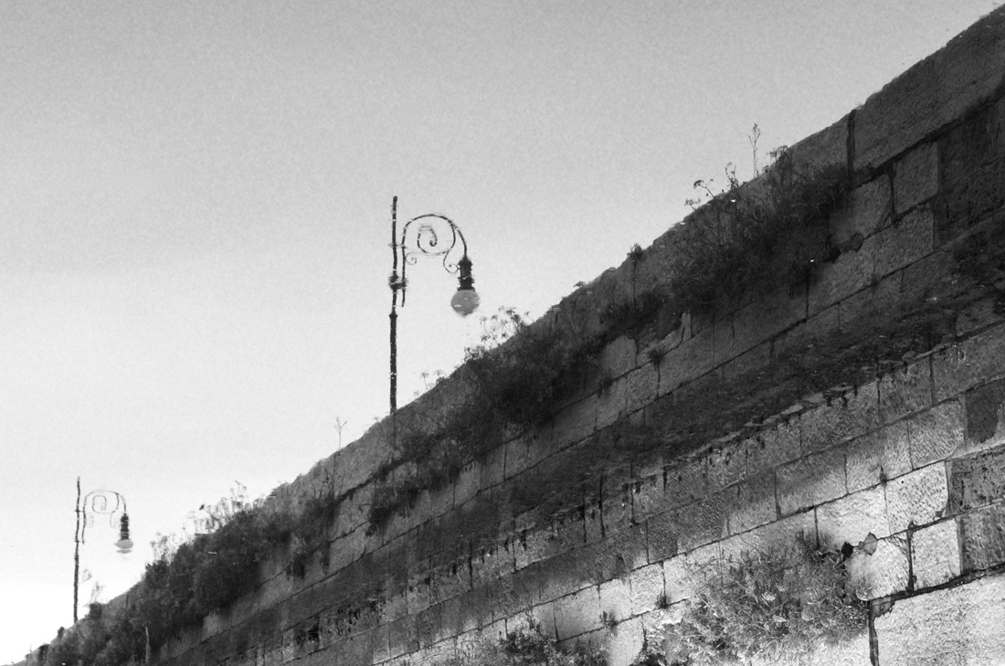 Bello il riflesso abbozzato dei lampioni che via via acquista matericità sul muro.