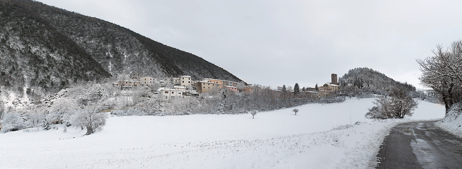 Belle le tinte pastello che affiorano dalla vegetazione innevata. Ottimo anche il taglio che esalta il bel distendersi del paesello. Complimenti Luca.