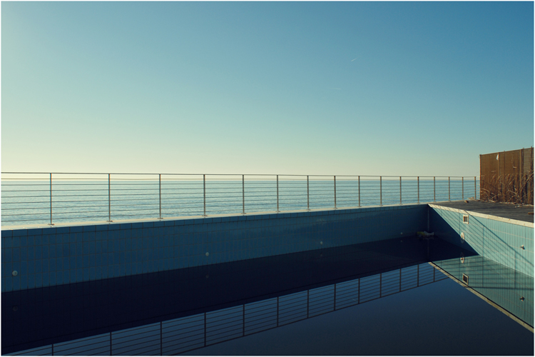 Per me una delle tue migliori da quando ti dedichi di nuovo con forza al colore. Perfetto il punto di scatto, che mette l'orizzonte esattamente una linea sotto il limite della barriera. Così la immaterialità del cielo risulta totale, in un a emozionante vuota luminosità . la lucidità della vasca interna è bellissima, immobile, catturando la specchiatura, rigorosa e intersecantesi, sia della parte destra e che sinistra del fotogramma. Sembra facile un risultato così, ma è difficilissimo.