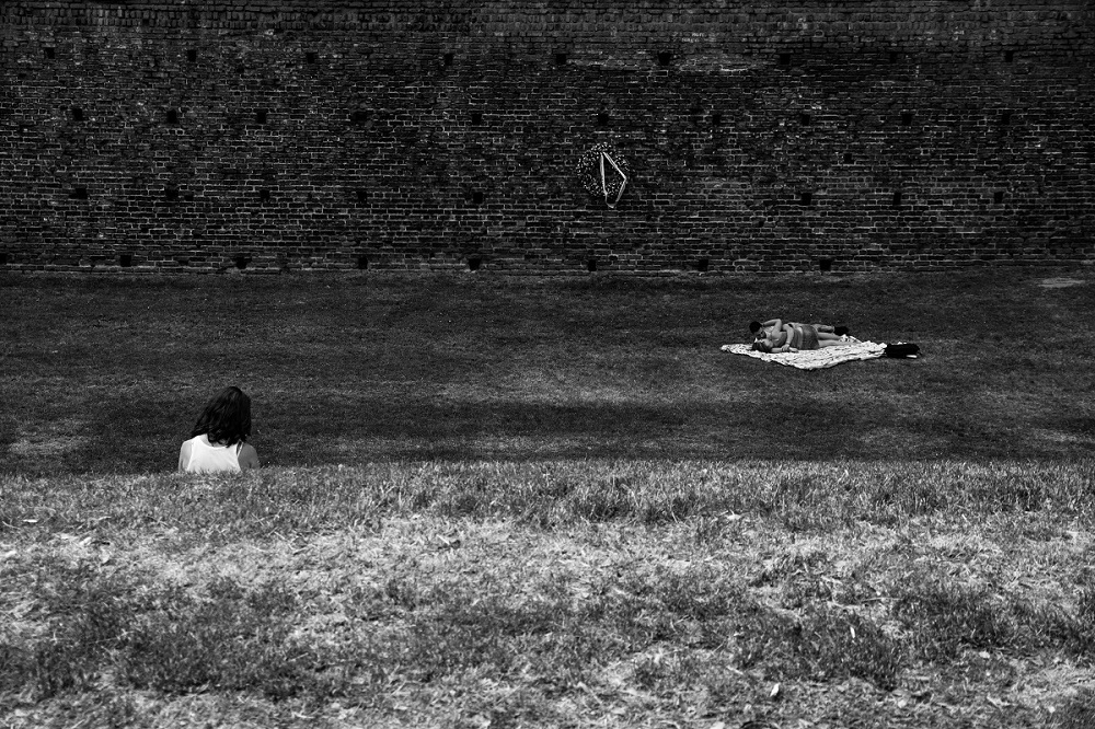 sono interessanti a livello compositivo come si sviluppano i tre piani, definiti dalle diverse tonalità di bn: prato/prato/muro. I personaggi come scritto sopra creano la storia. dovresti scegliere se sei più interessato alla composizione, campo ampio, gestendo in maniera efficace i tre livelli, agendo sulle diverse tonalità di bn; oppure la lui/lei/l'altra, in questo caso avvicini l'inquadratura per quando possibile croppando.