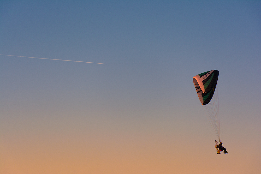 la fotografia è bella perché ognuno la interpreta a suo modo. infatti mentre alcuni di voi hanno interpretato l'aereo come un missile dal quale la persona vuole fuggire, la mia interpretazione (fantasiosa) è una competizione, un ''chi arriverà primo al traguardo'' tra i due soggetti. L'aereo o il deltaplano? ovviamente l'aereo ma mi piaceva l'accostamento surreale della sfida che si è creata in questa situazione. Ecco perché il titolo ''Bagarre..'' prendendo spunto dai duelli in moto GP.