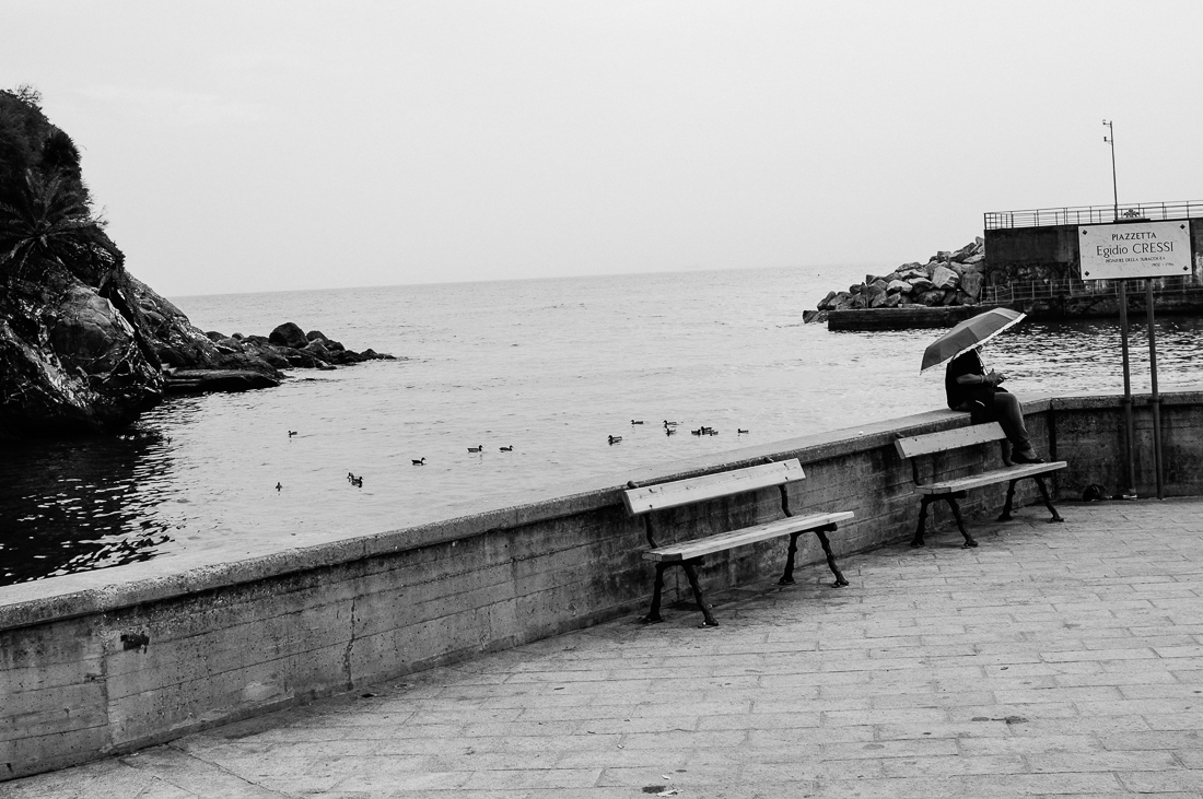 La figura sollto l'ombrello non ha la forza per reggere la foto, le paperelle sono comprimarie e le panchine sono davvero poco significative.