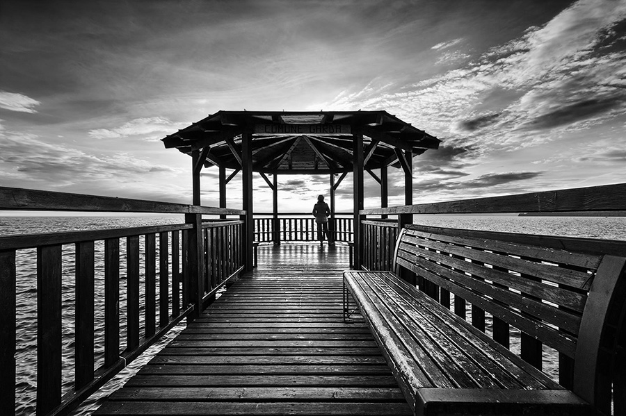 Sono stato un po' in dubbio dove postare questo scatto. Non lo considero un paesaggio vero e proprio e, valutando la presenza della persona, non proprio nemmeno architettura, ma per quest'ultima sezione giocano a favore le geometrie del pontile. Forse andava meglio in varie.......Se ci fosse una sezione solo per il BW la cosa sarebbe risolta....