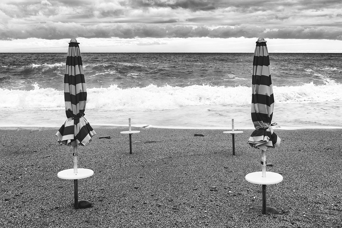 Gli ombrelloni come pilastri che reggono un tetto di nuvole.