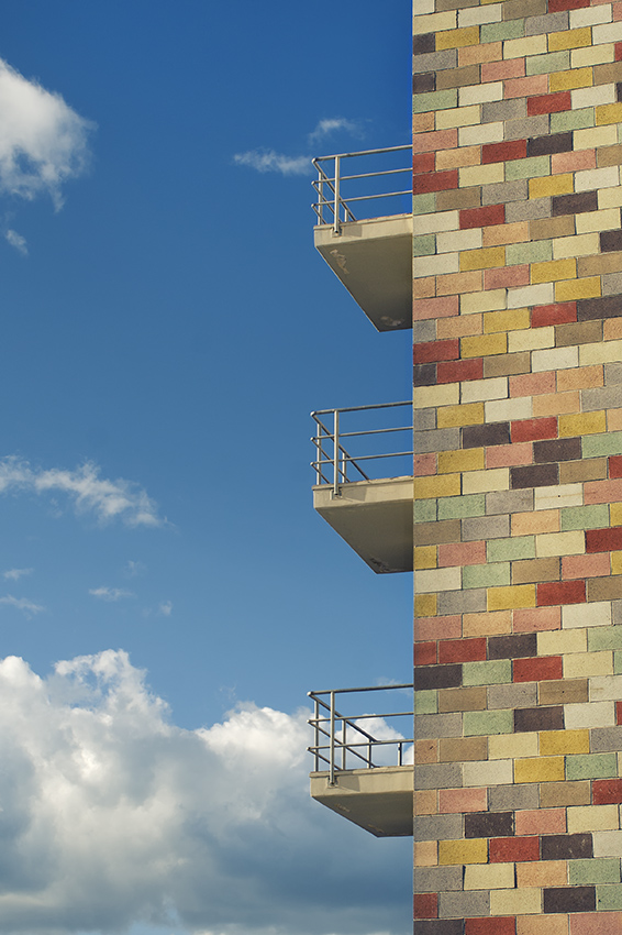 Di rado mi soffermo sulle immagini di architettura in quanto non ho le competenze specifiche ma questa mi piace particolarmente per quel dialogo tra i balconi e le nuvole e per quei mattoni multicolore.