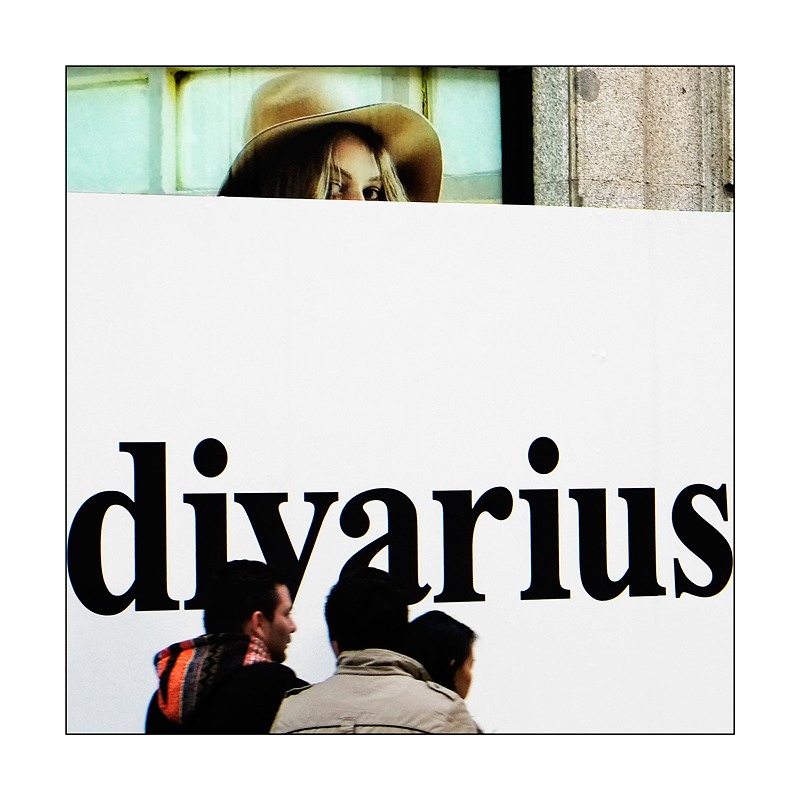 il divarius, tra lo sguardo in alto, che scruta nascosto, e le nuche e le vite dei soggetti in basso, noncuranti di quello che sta accadendo tra il fotografo e la ragazza con il cappello.