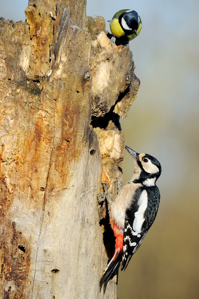 Tecnicamente mi trovi d'accordo con Liliana, però sei riuscito a immortalare un bellissima scena, dove sembra proprio che la cincia rimproveri il picchio per il baccano che fa. Ok!