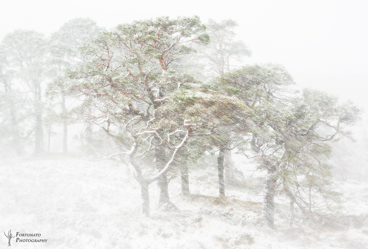 La cosa che mi colpisce di più di questa tua ripresa è proprio questo equilibrio compositivo, quel piccolo quid nel taglio che hai operato, che hai avvertito quasi istintivamente, per dare alla scena la giusta distribuzione , millimetrica della forze. Cose che si sanno senza impararle, che si scoprano solo agendo fotograficamente, e che chi guarda non può letteralmente acquisire, ma che può a sua volta scoprire di avere nel tempo. Per questo imparare a osservare la buona fotografia è didattico: non serve per emulare, deve servire solo come catalizzatore per le nostre stesse potenzialità ( se ci sono). Tutto è leggero, chiarissimo ed impalpabile, eppure il particolare paesaggistico racchiude in sè una grande forza, come una frustata diffusa e sanguigna ( notare le sfumature di colore ai tronchi oltre il fitto della precipitazione, che paiono cicatrici sanguinanti e simboliche dei colpi inferti dal vento, dalla pioggia e dall'inverno. ). Tutto intorno il bianco, che è come una densa sospensione di vita, un letargo vigile del nulla avvolto da questo impeto. Pochi alberi, che poi sfumano in lateralità nel nulla, a raccontare la drammaticità degli elementi.