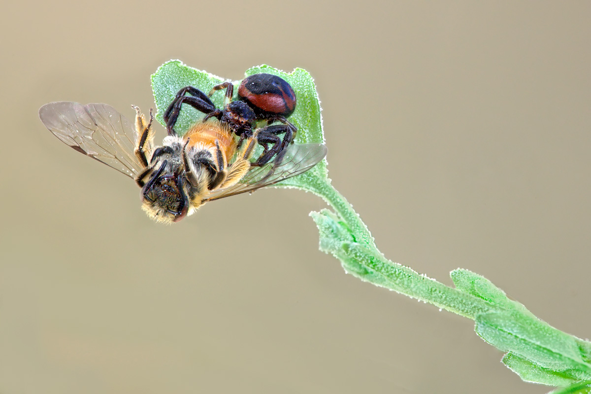 Il ragnetto napoleone.... forte e svelto!! hai ritratto un momento particolare e descrittivo del soggetto, bravo. _________________ StefanoIl mio sitowww.stefanopoccioni.com