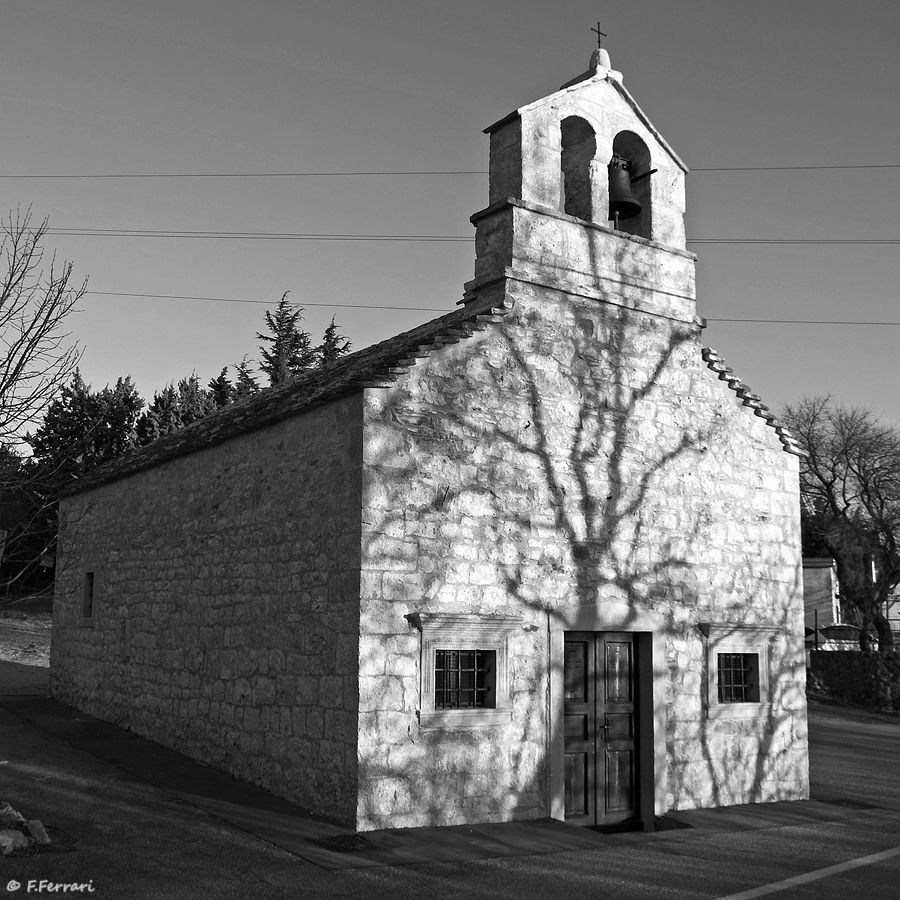 A mio gusto personale trovo che il punto di ripresa e il taglio stretto indebolisca il valore della foto anche se il soggetto principale per come lo concepisco io credo sia l'ombra dell'albero proiettata sulla facciata della chiesetta.