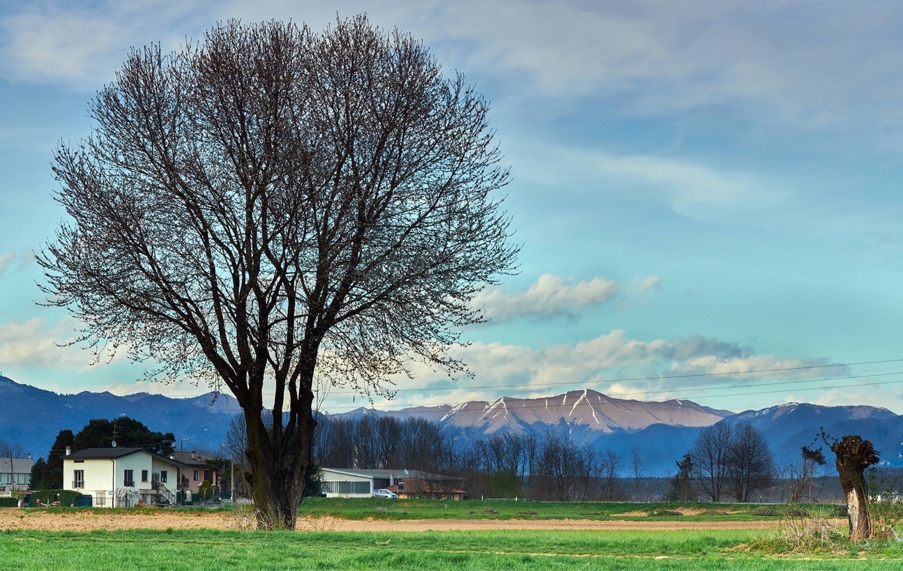 Forse l'albero capitozzato è troppo a margine, ma entra comunque in relazione con il suo gemello più fortunato dalla folta chioma. _________________ Paolo