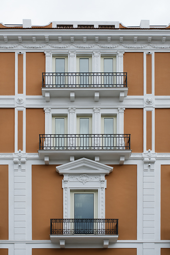 Cielo latteo che giustamente non ruba la scena, e tinta pastello protagonista, che duetta con il bianco nella bella facciata. Ottima sequenza di finestre e balconi a scalare dall'alto al basso.