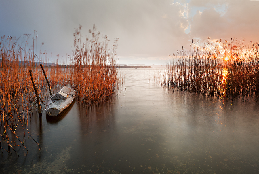 Sono, direi, i tuoi luoghi del cuore, che conosci come casa tua . Eppure ogni volta ce ne riveli una nuova affascinante sfumatura. In questo caso particolarmente accattivante la presenza di questo rosso arancio di sottili canne contro la tinta delicata e pastello dell'insieme. Sul mio schermo sia la barchetta che la vegetazione sembrarno avere un pizzico di maschera di contrasto di troppo. Magari è solo una mia impressione...
