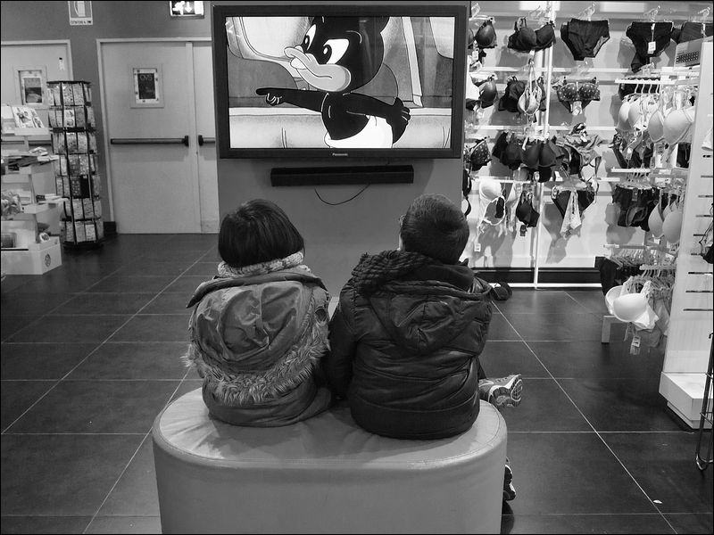 Carinissimi questi due piccoli spettatori, rapiti dal gesto imperativo del cartoon e assolutamente incuranti della barriera di reggiseni del contesto...