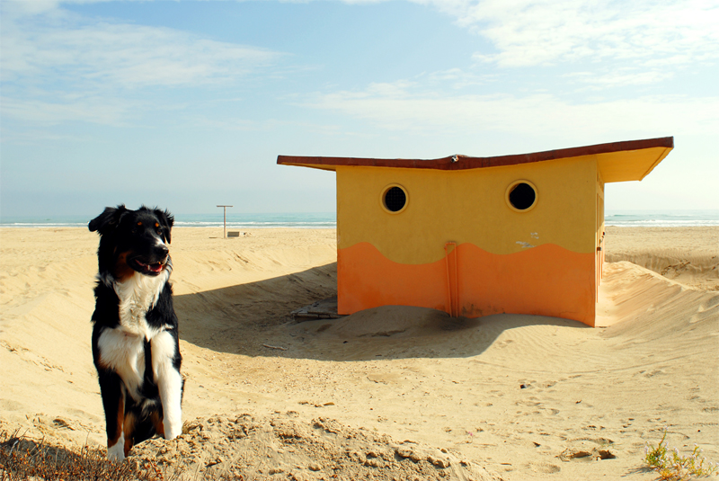 interessante come la capanna prende vita dai due fori, trasformandosi in uno sguardo, come quello del cane, che forse doveva essere meno in ombra.