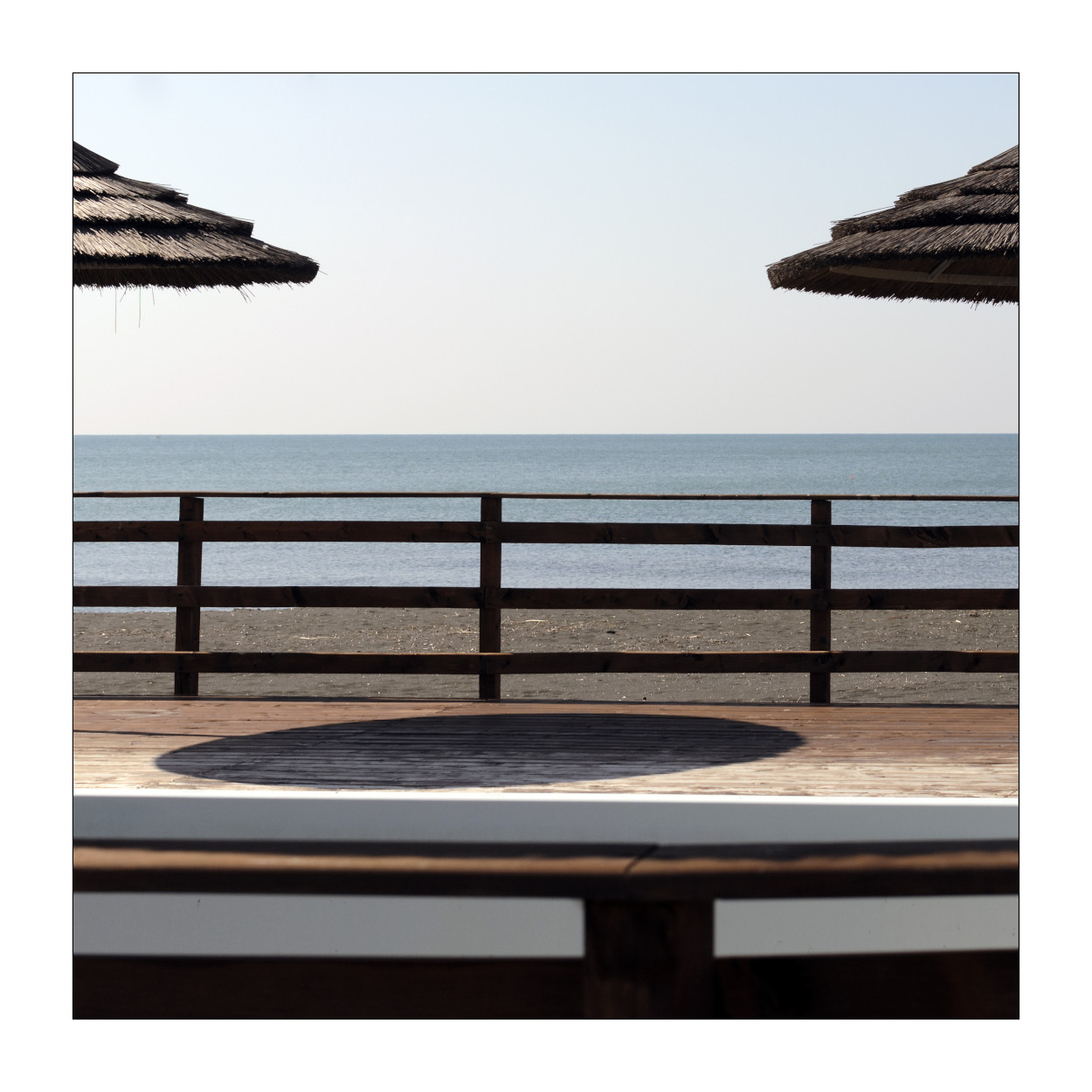 La proposta suggerita da carcat ha un senso in quanto elimina la non piacevolezza di quel primo piano fuori fuoco; però direi che la tua versione iniziale per me resta comunque più completa e sempre interessante per la atmosfera immobile e la luce intensa; l'ombra non centrale va accettata per come è, dato che qui un recupero di simmetrie e una maggiore pulizia formale è impresa non realizzabile con successo in post. andava al massimo ricercata in fase di scatto.
