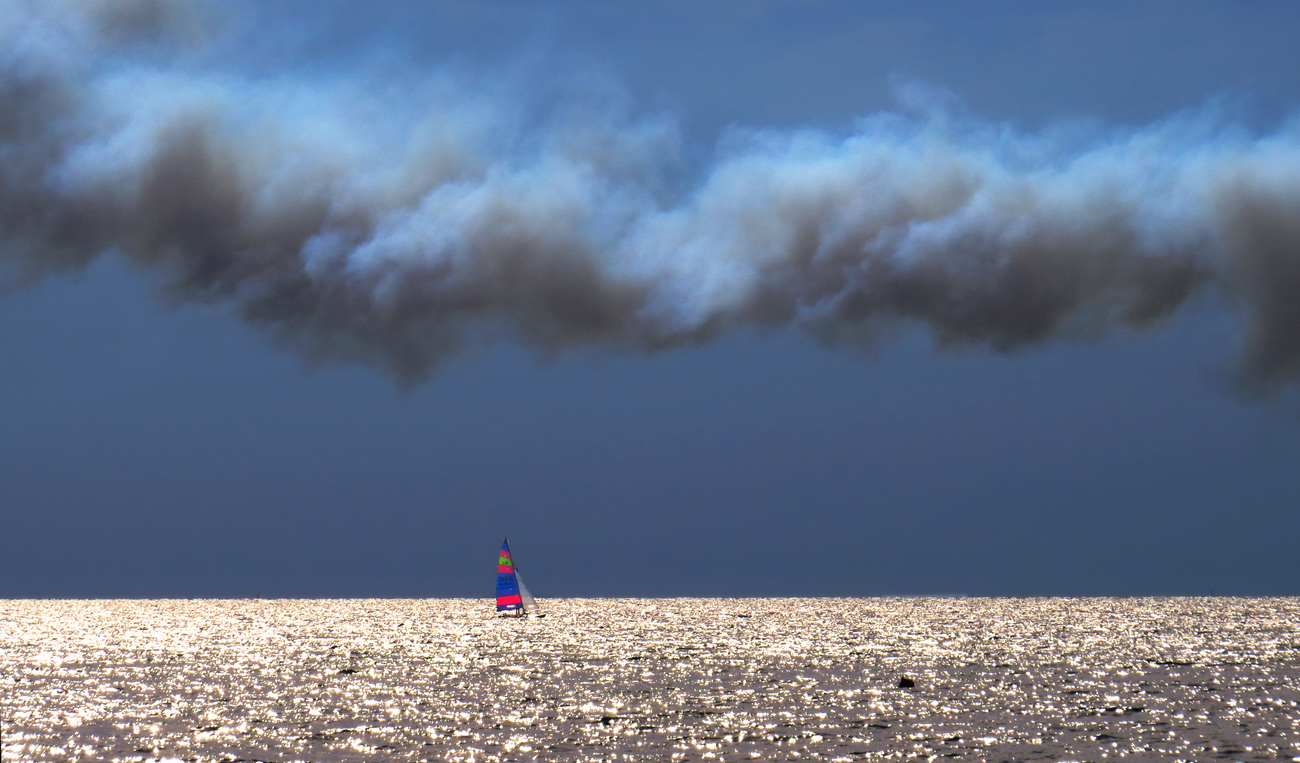Quando mi trovo innanzi a queste tue visioni paesaggistiche mi permetto di andare un attimo oltre la parte tecnica, (che comunque potrebbe avvantaggiatasi facilmente di una maggiore cura..., ad esempio pulendo le zone più rumorose) , e mi lascio andare a questa immersione in un mondo diverso: il coraggio, come sottolineato dalla vivacità quasi irreale del colore della vela, di questa navigazione su argento vivo, con la minaccia incombente di una nuvola immensa, senza fine, che sovrasta il suo viaggio come un gigante vendicativo. Scenari presi a prestito a paesaggio e fantasia in eguale misura, con un risultato d'impatto sempre sottilmente simbolico.