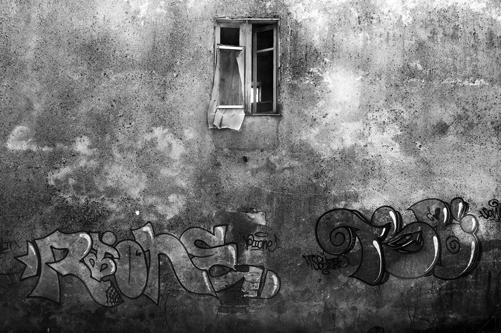 Il BN deciso così come il forte contrasto restituiscono un immagine dove disegno e materia se la contendono. Splendido il muro che pare spruzzato di china. Mi piace molto.