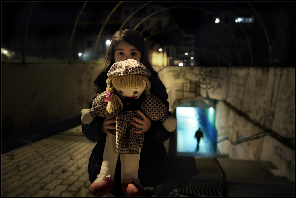 Gli occhi della bimba non mi restituiscono timore o emozioni per l'ipotetica insidia, sta sorreggendo un pupazzo, una bimba timorosa e che ha paura o lo stritola il pupazzo o lo lascia e rimane pietrificata...