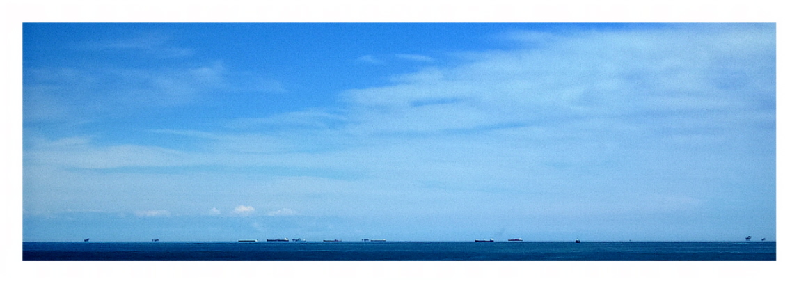 La sottile lineablù, sopra la quale sono poggiate le navi della collezione Micro Machines, è sovrastata dallo spesso clielo azzurro.