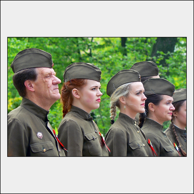La rievocazione (non avevo con me l'interprete ... si trattava - a quel che capivo - di canzoni e racconti di guerra, intervallati da danze e movimenti mimici) avveniva in un piccolo parco a lato della strada dove si svolgeva la parata ... ho fatto un bel po' di salti mortali per inquadrare evitando gli edifici, solo le fronde degli alberi potevano costituire uno sfondo accettabile.